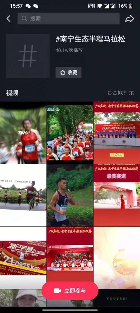 以小視頻的形式記錄比賽現(xiàn)場(chǎng)精彩瞬間,以分享有獎(jiǎng)活動(dòng)促熱度,截止5月30日,抖音話題#南寧生態(tài)半程馬拉松#互動(dòng)視頻104條,播放量達(dá)40萬,活動(dòng)話題大熱網(wǎng)絡(luò)。