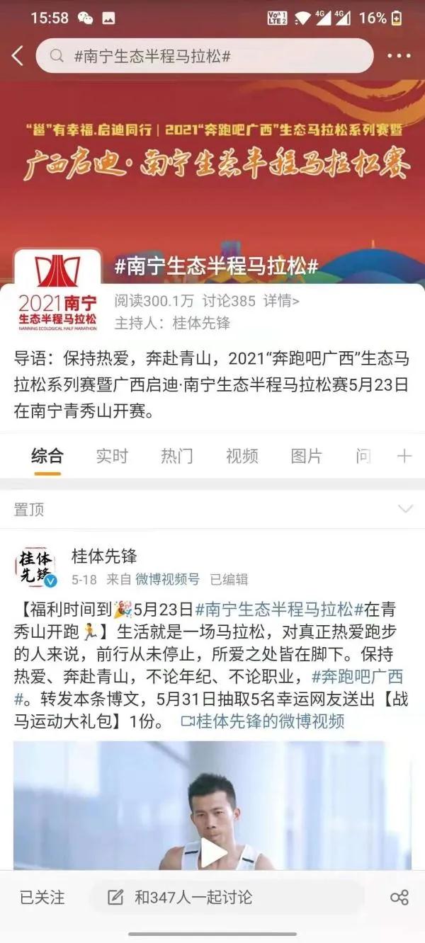 微博話題#南寧生態(tài)半程馬拉松#討論385條,為活動(dòng)持續(xù)造勢(shì),引發(fā)話題熱度,閱讀量逾300.1萬次。