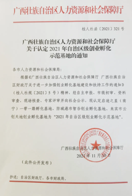 2021年11月10日,廣西壯族自治區(qū)人力資源和社會(huì)保障廳公布了關(guān)于2021年自治區(qū)級(jí)創(chuàng)業(yè)孵化示范基地認(rèn)定結(jié)果的通知。啟迪之星(南寧)一帶一路孵化基地從眾多創(chuàng)業(yè)孵化器中脫穎而出,被認(rèn)定為本年度三家自治區(qū)級(jí)創(chuàng)業(yè)孵化示范基地之一。此次獲評(píng)意味著在各級(jí)政府部門的支持下,基地將提升建設(shè)水平和服務(wù)能力,進(jìn)一步發(fā)揮示范引領(lǐng)作用為更多初創(chuàng)企業(yè)提供更優(yōu)質(zhì)的孵化服務(wù)。