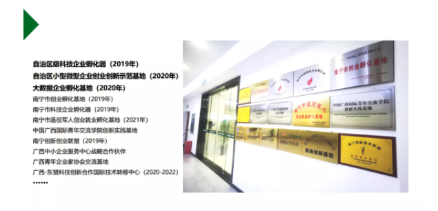 基地運(yùn)營(yíng)三年時(shí)間已先后獲評(píng)為“自治區(qū)級(jí)科技企業(yè)孵化器”“自治區(qū)小型微型企業(yè)創(chuàng)業(yè)創(chuàng)新示范基地”“大數(shù)據(jù)企業(yè)孵化基地”“南寧市創(chuàng)業(yè)孵化基地”“南寧市科技企業(yè)孵化器”“南寧市退役軍人創(chuàng)業(yè)就業(yè)孵化基地”等榮譽(yù)資質(zhì)。