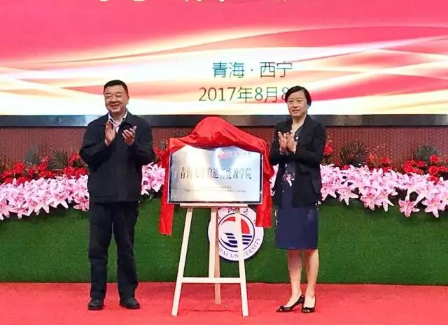 ▲ 青海省委常委、宣傳部長(zhǎng)張西明與袁桅總裁(右)為青海大學(xué)啟迪新能源學(xué)院成立揭牌
