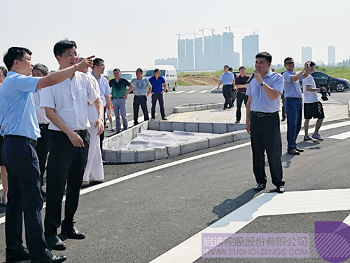 趙東副總裁(左一)向陳邂馨書(shū)記(左二)介紹基地情況