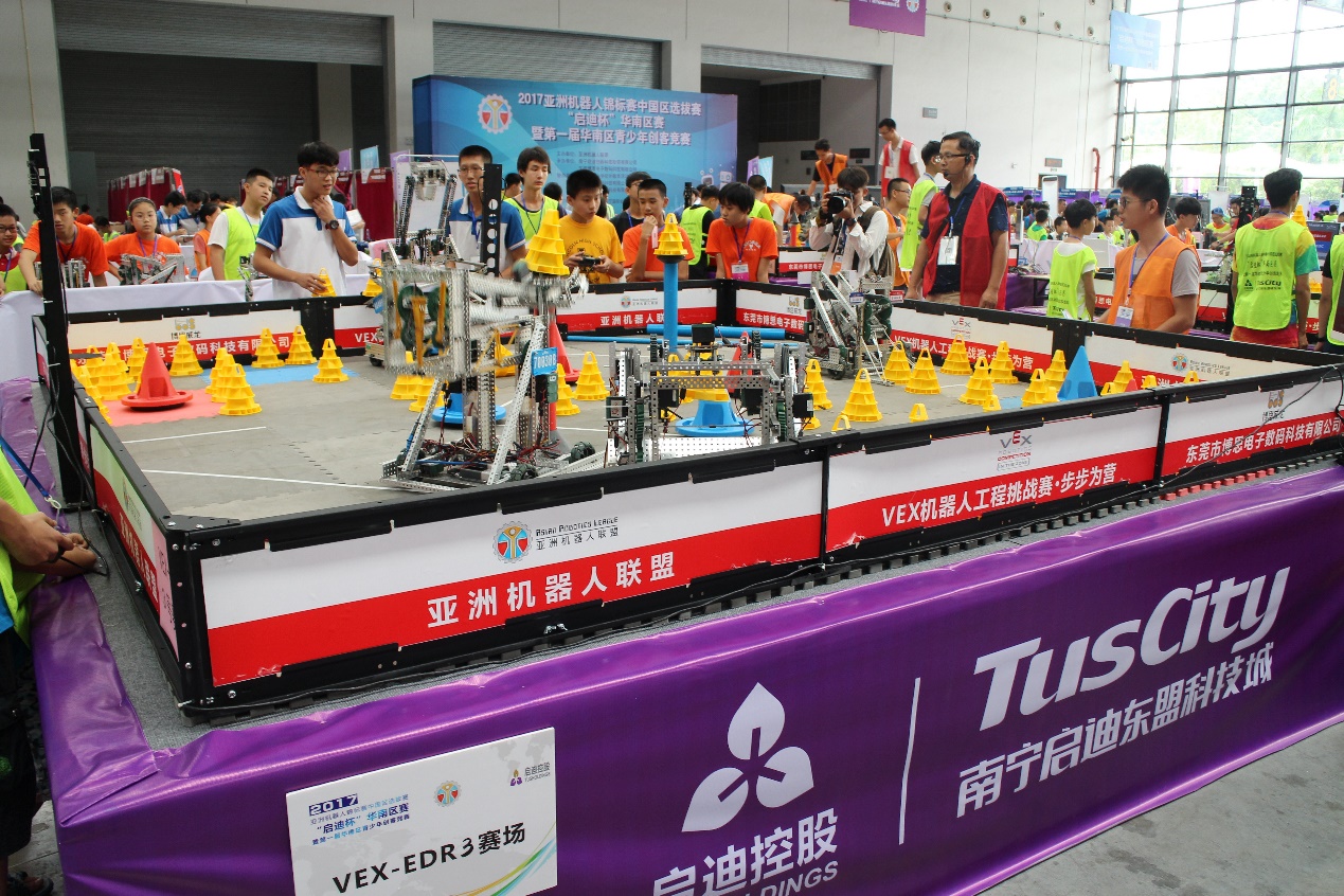 本次比賽有300多支隊伍、近千人齊聚廣西南寧展開賽事角逐,賽事期間將舉辦機器人論壇、機器人賽事、創(chuàng)客競賽,涵蓋3D打印筆、瘋狂投石、拔河機器人等項目。其中,本屆“啟迪杯”華南區(qū)賽VEX EDR機器人工程挑戰(zhàn)賽、VEXIQ挑戰(zhàn)賽以及BDS工程挑戰(zhàn)賽項目的優(yōu)勝隊伍將獲得參加2017亞洲機器人錦標賽中國區(qū)選拔賽的資格。