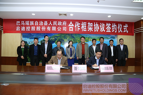 啟迪控股常務(wù)副總裁、啟迪科技城集團董事長陳響(前排左)與廣西巴馬縣長藍海洲(前排右)簽署大健康產(chǎn)業(yè)合作框架協(xié)議