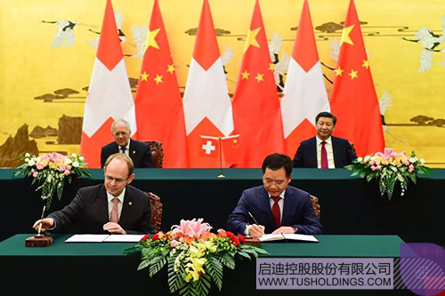2016年4月,中國(guó)國(guó)家主席習(xí)近平與瑞士國(guó)家主席施耐德·阿曼共同見(jiàn)證啟迪控股董事長(zhǎng)王濟(jì)武(前排右)與瑞士國(guó)家創(chuàng)新園簽署合作協(xié)議