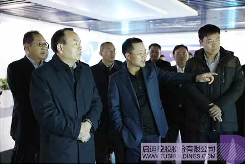 王濟(jì)武董事長(前排左二)向唐良智書記(前排左一)介紹啟迪控股業(yè)務(wù)布局